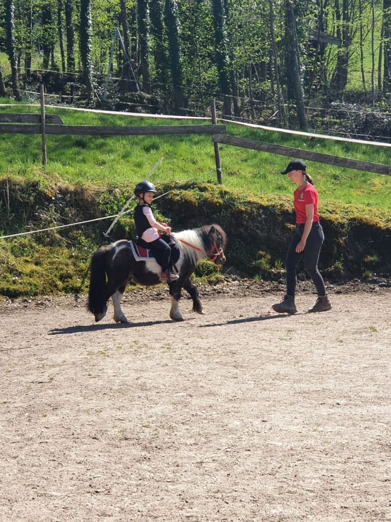 Der Reitunterricht 1 ist speziell auf die Ponyfreunde im Alter von etwa 5 bis 10 Jahren zugeschnitten. Mit unseren Ponys können die Kinder in Kleingruppen erste Erfahrungen im Umgang mit den Ponys und auf dem Ponyrücken sammeln und diese weiter ausbauen. Natur und Tiere können mit allen Sinnen erlebt und erfahren werden. Die Gruppen sind nach dem Alter und den Vorkenntnissen der Kinder gestaffelt. Altersgerecht werden alle Inhalte rund ums Pony vermittelt. Die Kinder lernen, wie man ein Pony putzt, sattelt und führt. Auf dem Pony werden Sitzübungen zur Schulung des Gleichgewichts durchgeführt bis hin zum selbstständigen Reiten in Schritt und Trab. Am Reitunterricht 1 nehmen die Kinder ohne Begleitperson teil, Begleitpersonen dürfen gerne im Hof auf der Terrasse oder im Aufenthaltsraum warten.